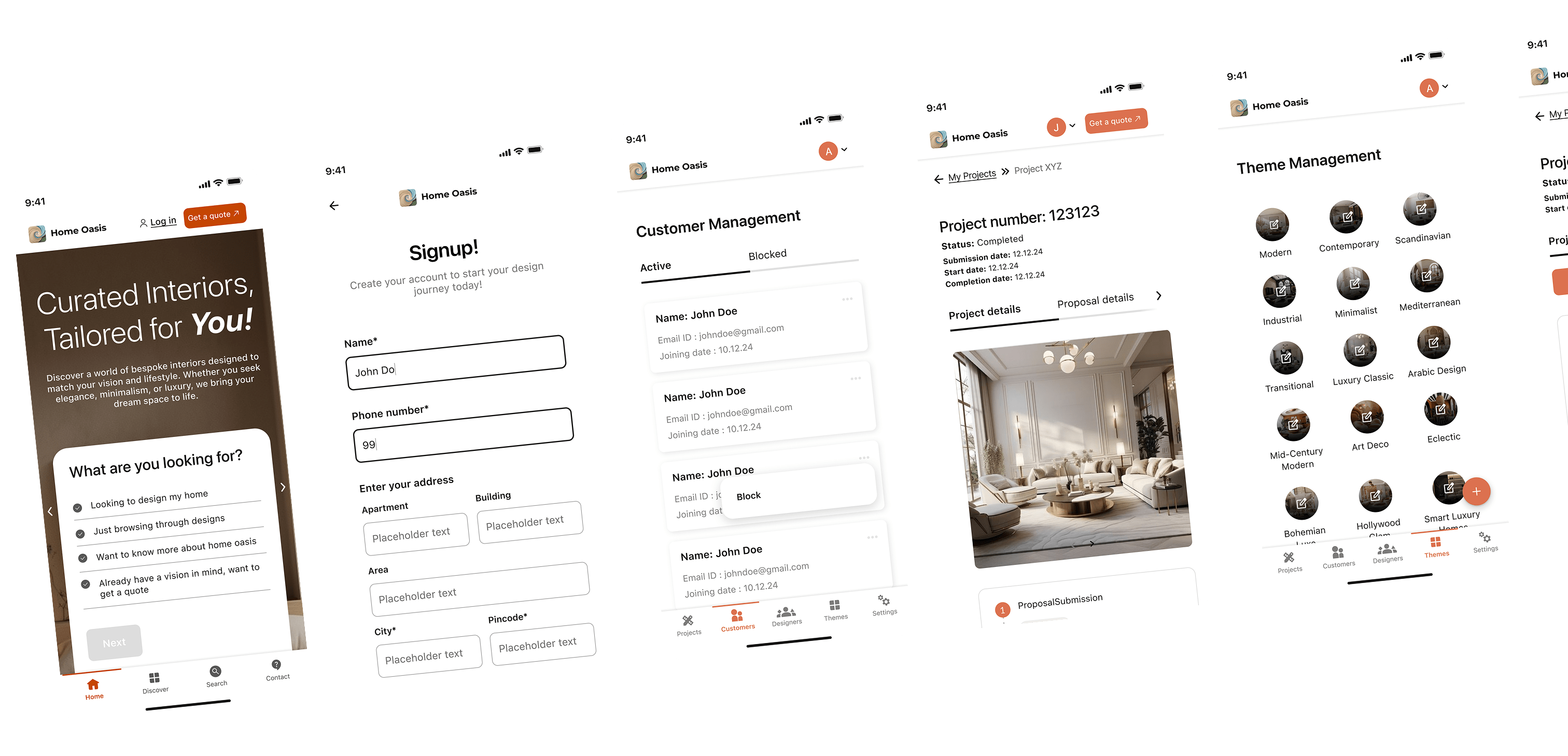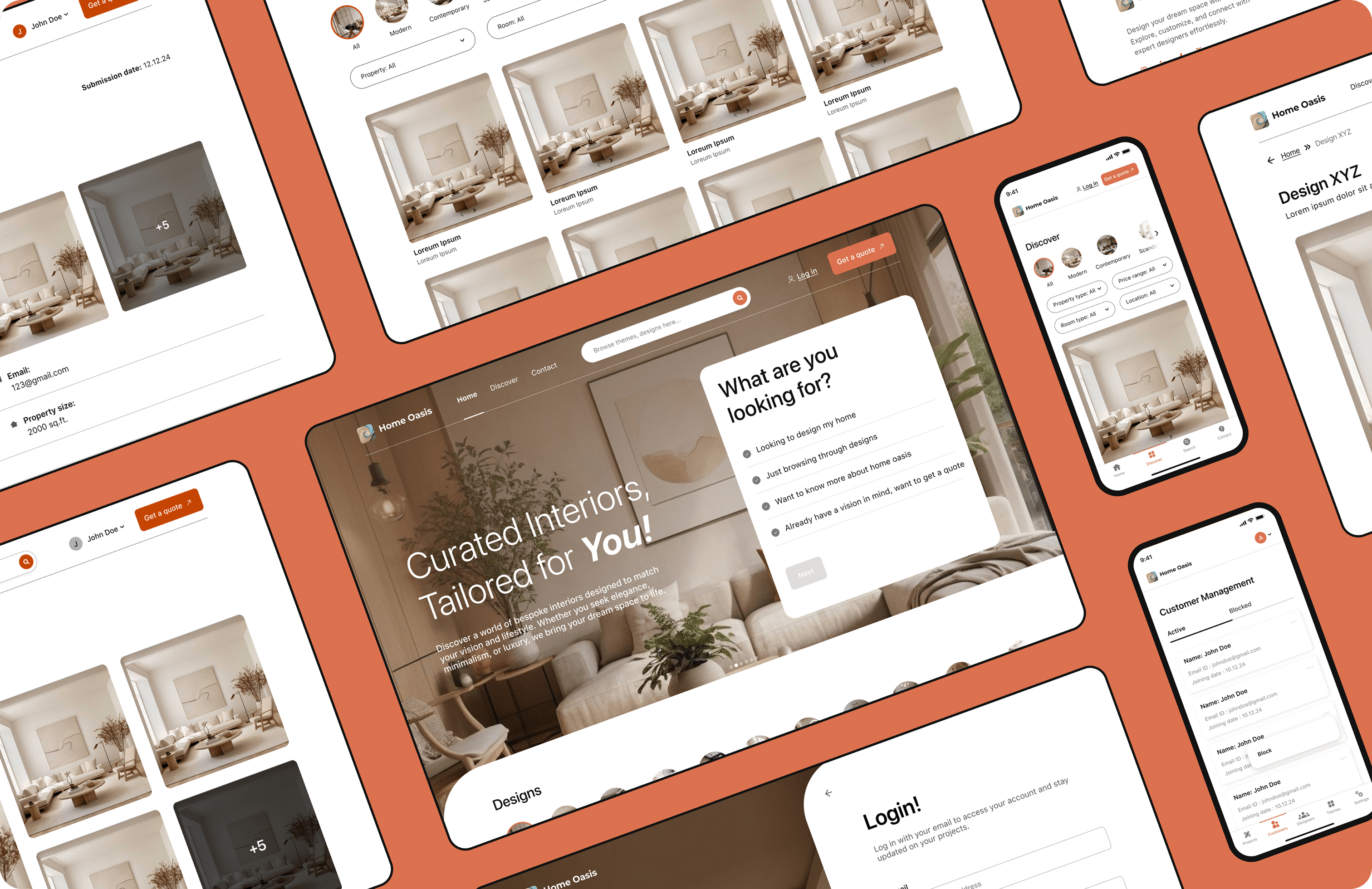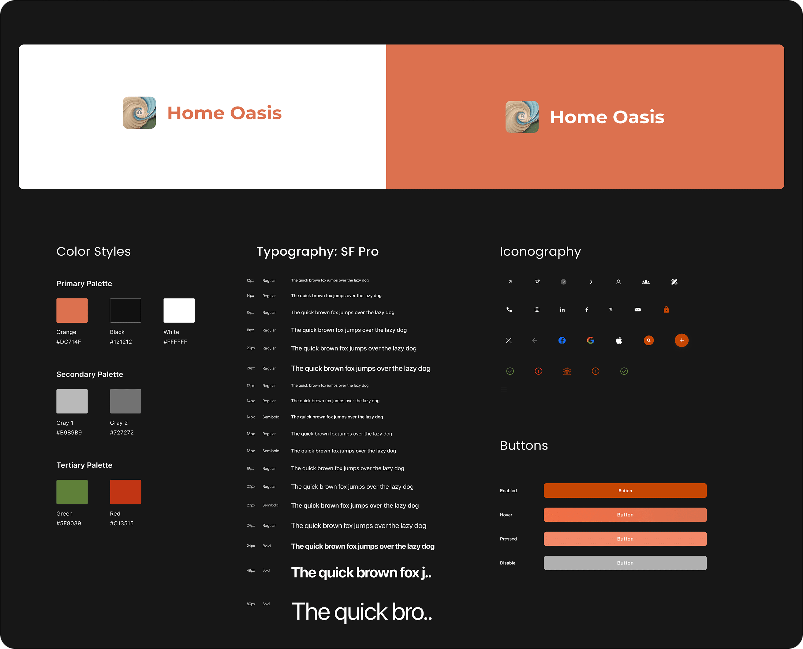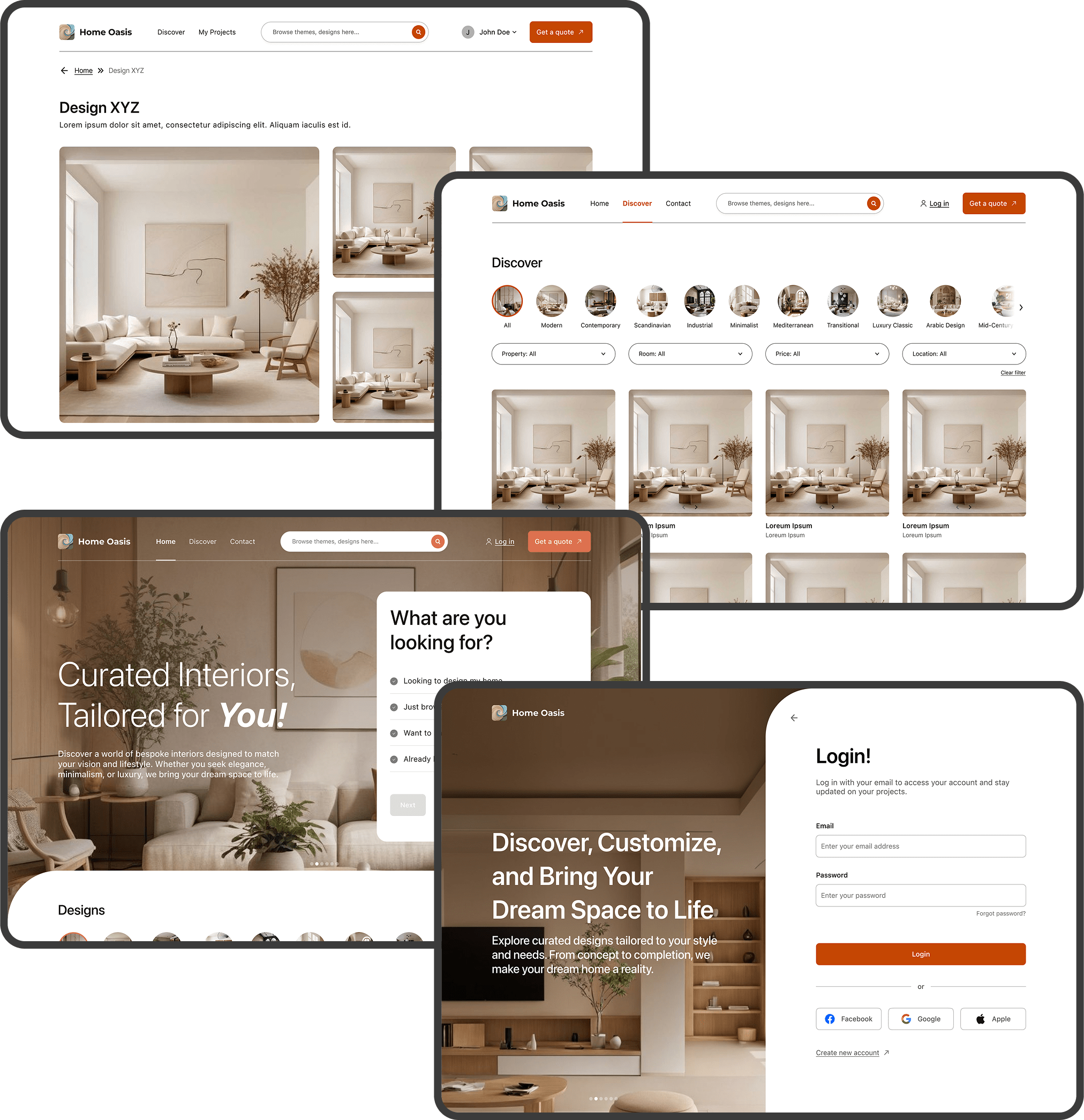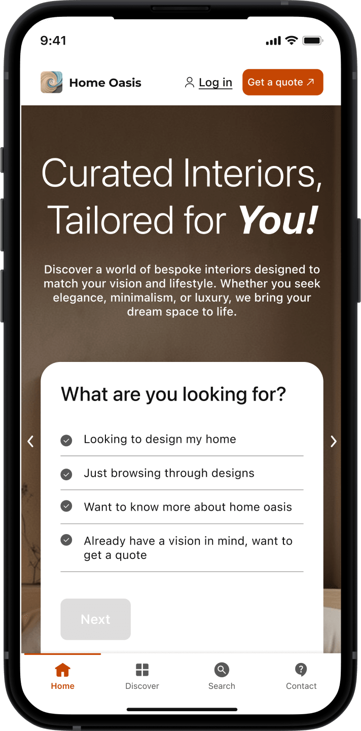 Our research encompassed interviews with UAE homeowners, designers, and architects, revealing critical insights about cultural design preferences, project management pain points, and payment security concerns across Dubai and Abu Dhabi's diverse communities. Through comprehensive competitive analysis and cultural immersion studies, we identified the need for a platform that balances luxury market sophistication with accessible user experiences. The Home Oasis brand emerged as a premium yet approachable identity, utilizing warm orange as our primary color to symbolize creativity, transformation, and the golden desert heritage of the UAE, while sophisticated typography and minimalist design elements communicate trust and excellence to discerning clientele.