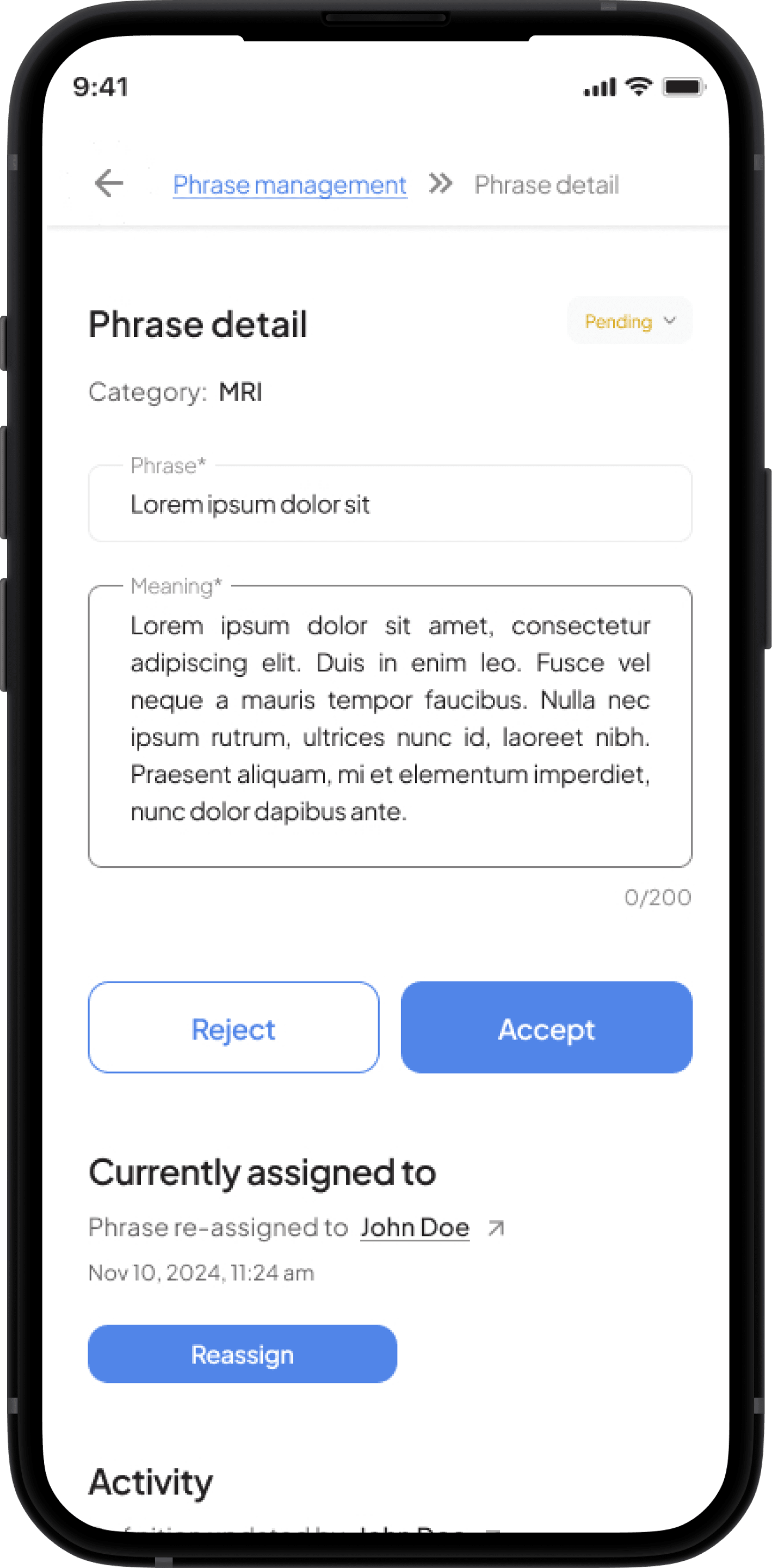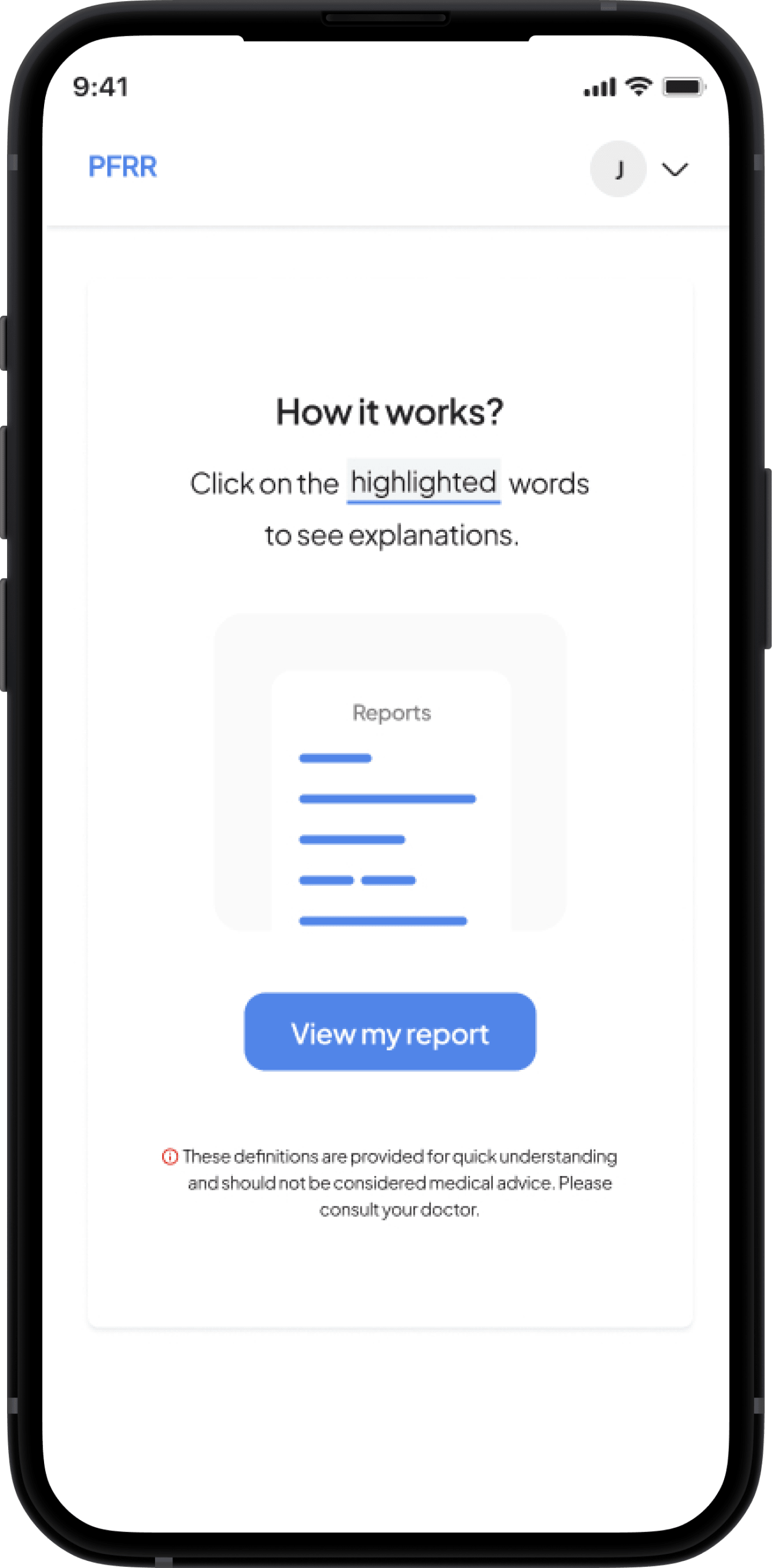Our solution highlights unfamiliar terms directly within the report and provides simplified, clinically accurate definitions when users click on them.