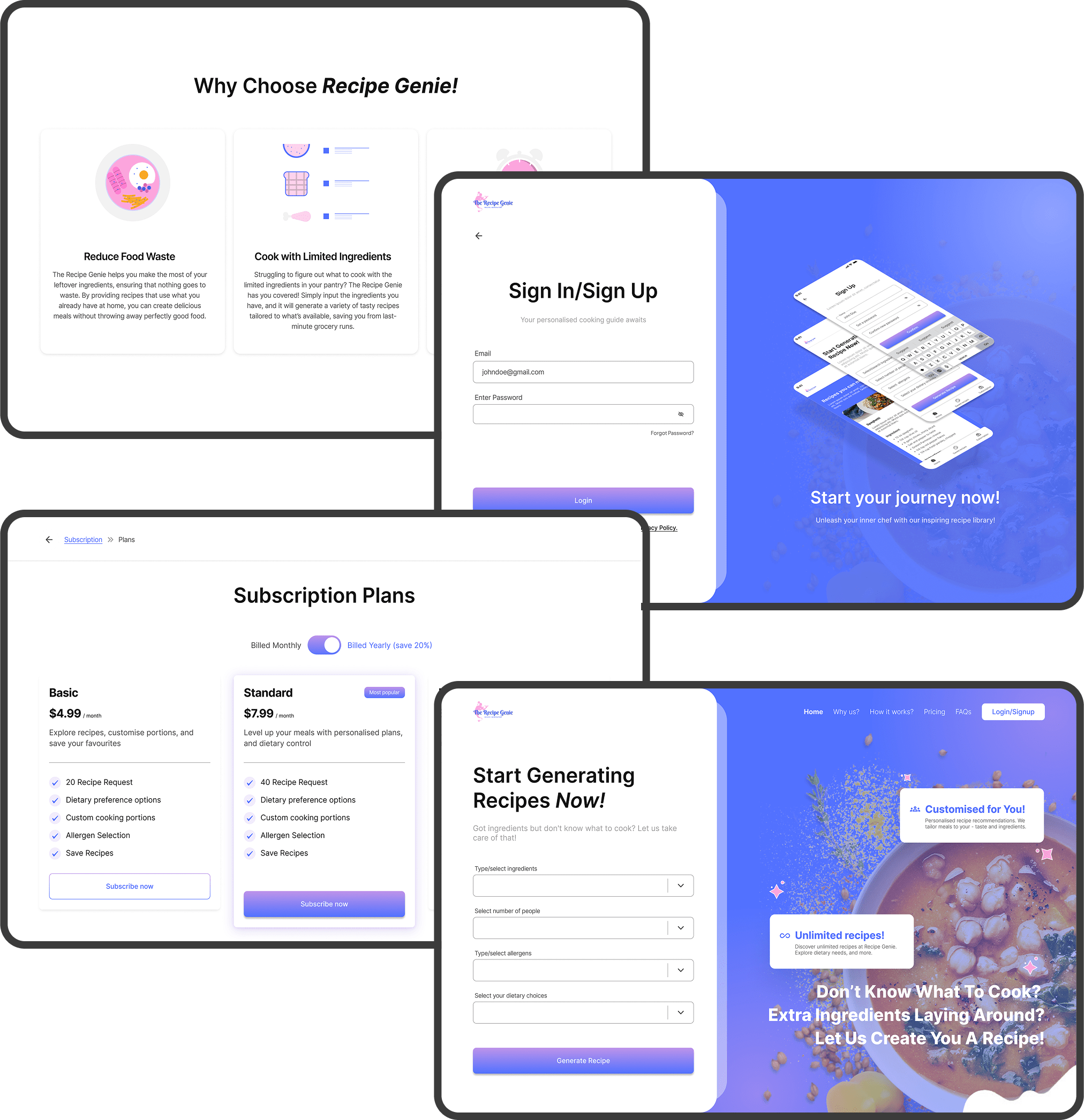 Recipe Genie is an AI-powered culinary companion designed to transform the way people cook at home. Instead of endlessly scrolling through recipe websites, users simply input their allergies, dietary restrictions, or available ingredients, and Recipe Genie instantly generates personalized recipes tailored to their needs. From quick weekday meals to creative dishes that minimize food waste, the platform ensures cooking is always convenient, safe, and inspiring.