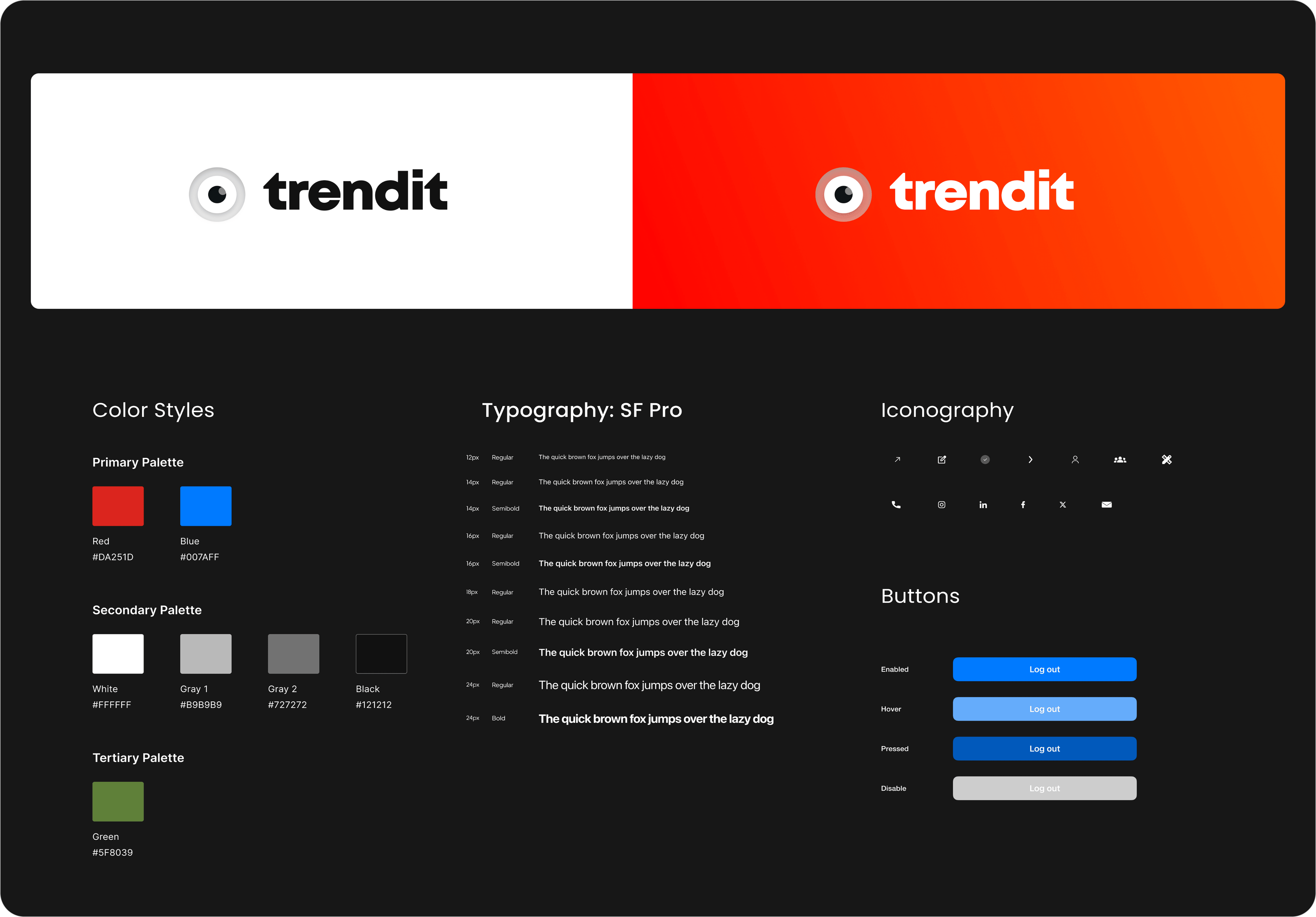 We interviewed event-goers across music, fitness, and culture scenes, plus organizers from clubs and community groups. Pain points were consistent: too much noise, not enough curation, and group coordination chaos. Competitor audits showed strong discovery or strong ticketing—but rarely both with social context. Brand-wise, Trendit needed to feel energetic, trustworthy, and inclusive. We landed on a bold yet minimal visual language, expressive accent colors for genres, and a tone that’s equal parts insider and approachable—welcoming curious first-timers and seasoned scene-goers alike.